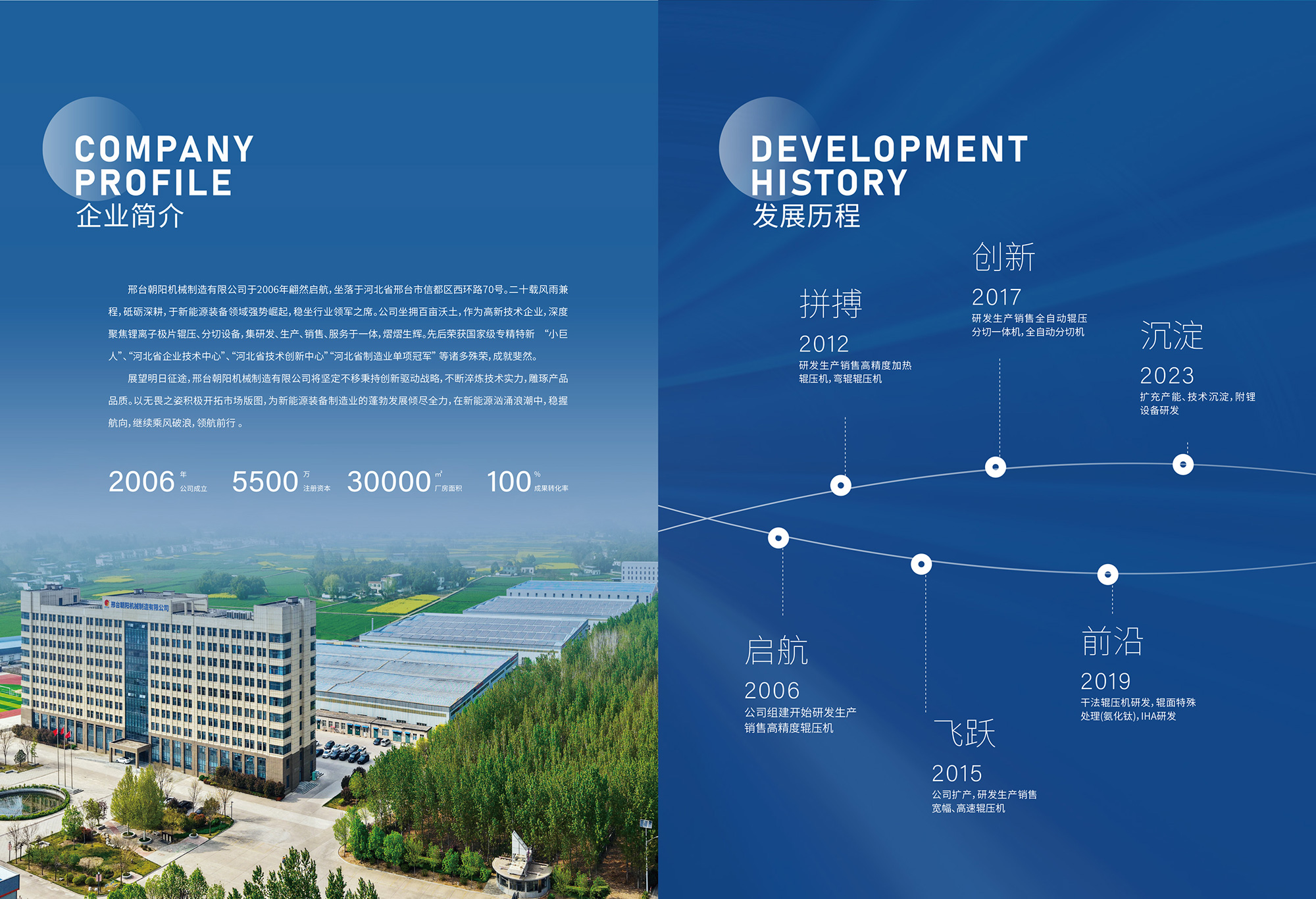 邢台朝阳机械制造有限公司是新能源装备领域的璀璨之星,位于河北省邢台市信都区会宁镇(邢台会宁综合物流聚集地) 70 号,自2006 年成立以来,历经 20 年砥砺奋进,已成长为新能源装备领域的行业领军者。公司占地 100 余亩,是集锂离子电池极片... [更多>>]